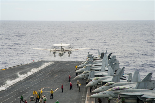 Máy bay trinh sát E-2C Hawkeye cất cánh từ tàu sân bay USS George Washington (CVN 73) trên biển Philippines ngày 26.10.2014. Nhóm tàu sân bay chiến đấu này đang luyện tập để sẵn sàng chiến đấu bảo vệ lợi ích hàng hải của Mỹ và các đồng minh cùng đối tác ở khu vực Ấn Độ Dương  - Thái Bình Dương, theo trang web Hải quân Mỹ