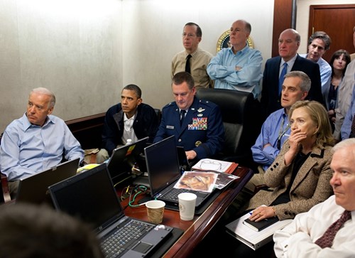 Tổng thống Barack Obama cùng với Phó tổng thống Joe Biden cùng các cộng sự thân cận theo dõi chiến dịch tiêu diệt Bin Laden.