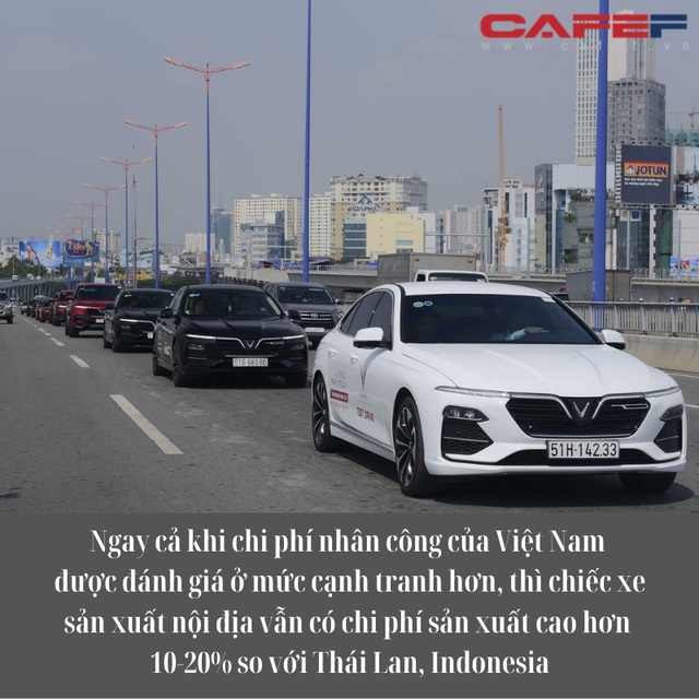 Theo ông Hiroyuki Ueda – Tổng giám đốc Toyota Việt Nam, giá thành sản xuất linh kiện tại Việt Nam cao hơn 2 tới 3 lần so với khu vực. Do đó, ngay cả khi chi phí nhân công của Việt Nam được đánh giá ở mức cạnh tranh hơn, thì chiếc xe sản xuất nội địa vẫn có chi phí sản xuất cao hơn 10-20% so với Thái Lan, Indonesia.