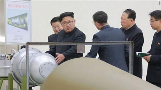 Chủ tịch Triều Tiên Kim Jong-un bên cạnh thiết bị được cho là bom nhiệt hạch. (Ảnh: KCNA).