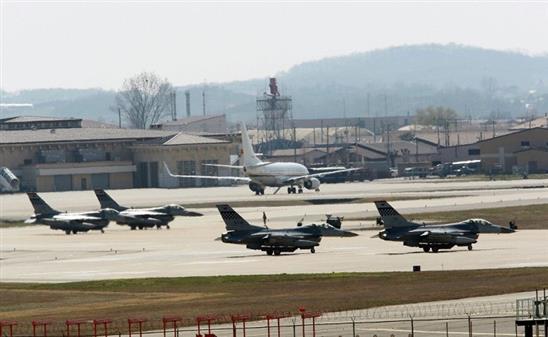 Tiêm kích F-16 trên đường băng tại căn cứ không quân Mỹ ở Osan, Hàn Quốc. (Ảnh: AP).