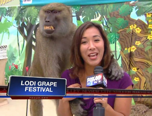 Nữ phóng viên xinh đẹp Sabrina Rodriguez của kênh truyền hình Fox 40 của Mỹ đang đến thành phố Sacramento gặp gỡ chú khỉ đầu chó Mickey nhằm thực hiện một chương trình giới thiệu về lễ hội nho Lodi ở địa phương vừa mới được tổ chức.