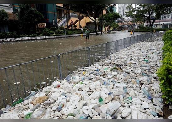 Rác và xốp được rửa sạch và gom lại trên đường. (Ảnh: Ap)
