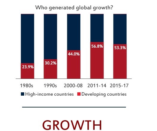 Sự đóng góp của các nước đang phát triển cho tăng tưởng kinh tế toàn cầu đã đạt đỉnh điểm trong giai đoạn 2011-2014, chiếm tỷ trọng 58,6%. Tuy nhiên, trong giai đoạn 2015-2017, mức đóng góp này được dự báo sẽ giảm xuống còn 53,3%, vẫn cao hơn tỷ trọng của các nước phát triển.