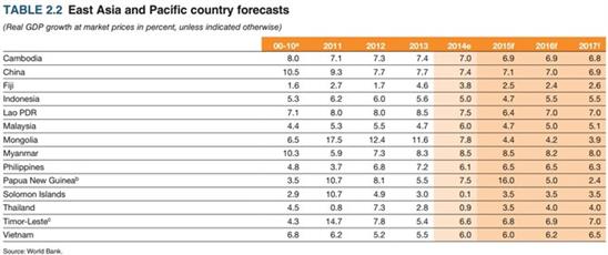 Đối với Khu vực Đông Á - Thái Bình Dương, WB dự báo tăng trưởng sẽ giảm nhẹ xuống mức 6,7% trong năm 2015 và duy trì ở mức đó trong 2 năm tới. Riêng với Việt Nam, dự báo tăng trưởng được giữ nguyên ở mức 6% năm nay và 6,2% năm 2016.