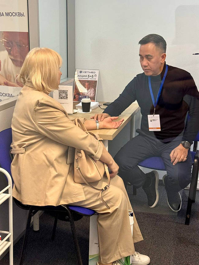 Gian hàng của Việt Med thu hút đông đảo khách tham quan và đại biểu quốc tế. Nhiều chuyên gia Nga — từ giảng viên, bác sĩ trẻ đến nhà nghiên cứu đầu ngành — đã trực tiếp trải nghiệm quy trình chẩn đoán theo nguyên lý Đông y và bày tỏ ấn tượng với tính khoa học, hiệu quả và tính nhân văn trong phương pháp điều trị. Không ít đại biểu bày tỏ mong muốn thiết lập hợp tác nghiên cứu và trao đổi chuyên môn lâu dài, đặc biệt trong lĩnh vực phục hồi chức năng và chăm sóc sức khỏe không dùng thuốc.