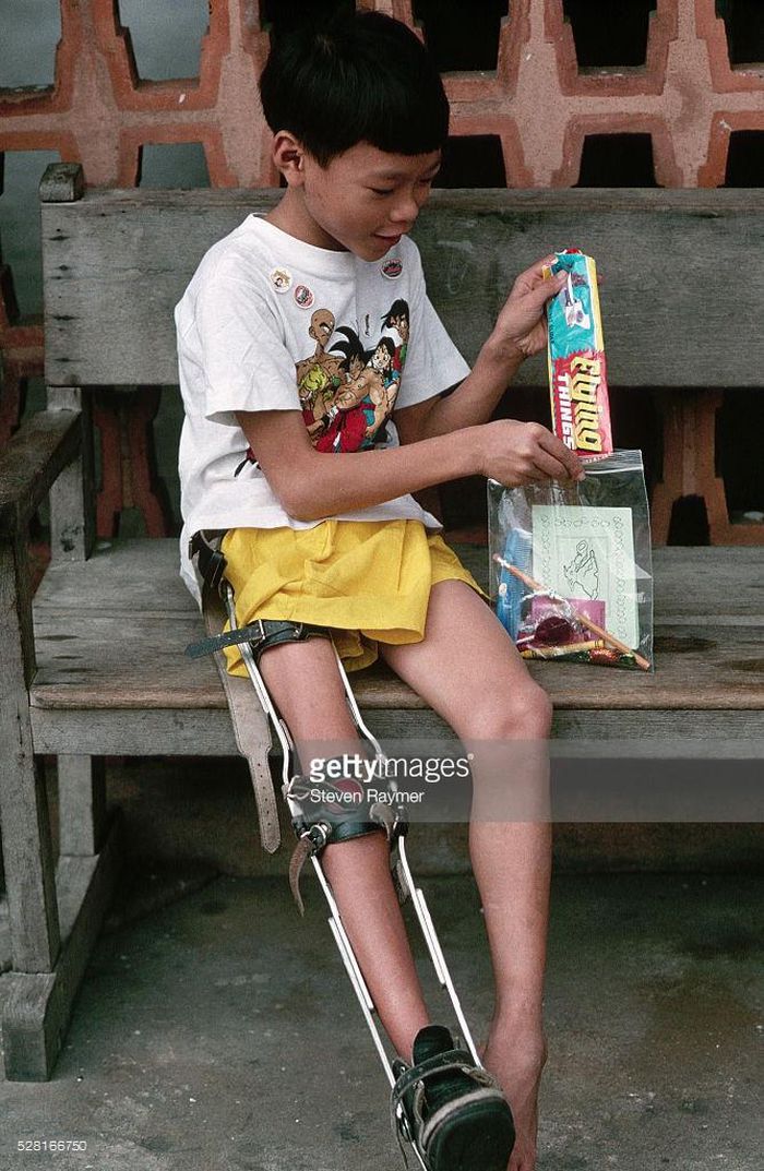 Cậu bé mồ côi bị bại liệt vui mừng với món quà vừa được tặng.