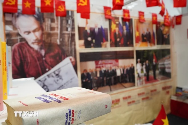 Tác phẩm của Tổng bí thư Nguyễn Phú Trọng tại Gian trưng bày. (Ảnh: Duy Trinh/TTXVN).