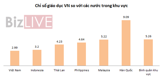 Đánh giá của Ngân hàng Thế giới về kinh tế trí thức cho thấy, chỉ số giáo dục của Việt Nam năm 2012 là 2.99, xếp thứ 133 thế giới, thấp hơn mức bình quân 5.26 của khu vực. Trong khi đó, Hàn Quốc là 9.09; Malaysia là 5.22...