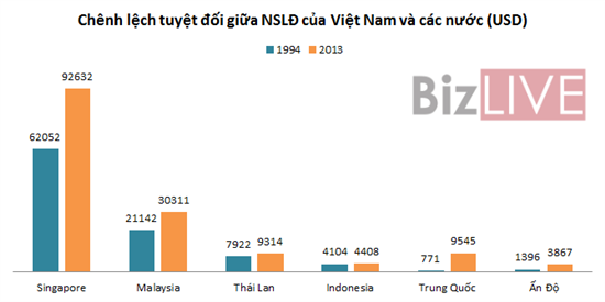 Tuy nhiên, khoảng cách tuyệt đối tính bằng chênh lệch giữa năng suất lao động của Việt Nam với hầu hết các nước ASEAN lại đang gia tăng. Chênh lệch giữa NSLĐ của Singapore và Việt Nam tăng từ 62.052 USD năm 1994 lên 92.632 USD năm 2013; tương tự, so với Malaysia, chênh lệch tăng từ 21.142 USD lên 30.311 USD...