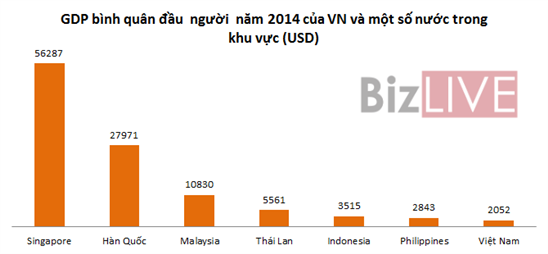 Theo tính toán, GDP bình quân đầu người của Việt Nam năm 2014 chỉ bằng 3/5 của Indonesia, 2/5 của Thái Lan; 1/5 của Malaysia; 1/4 của Hàn Quốc và bằng 1/27 mức GDP bình quân của Singapore.