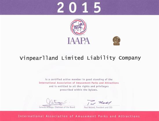 Vinpearlland chính thức trở thành thành viên của tổ chức IAAPA - Hiệp hội các khu vui chơi giải trí quốc tế lớn nhất thế giới. IAAPA được coi như chứng chỉ uy tín về chất lượng, an toàn cảnh quan mà bất cứ khu vui chơi giải trí nào cũng muốn hướng tới.
