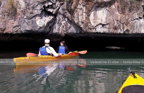 "Ông bà Smith" chèo thuyền kayak thăm thú vịnh Hạ Long. Ảnh: NTT.