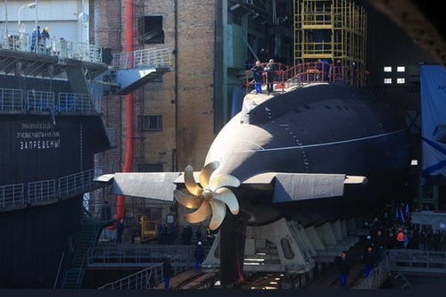 Đồng thời Hạm đội Biển Đen sẽ được trang bị sáu chiếc tàu ngầm diesel-điện lớp Varshavyanka, thuộc dự án 636 (NATO gọi là Kilo). Theo kế hoạch, 6 tàu ngầm này phải được hoàn thành trong năm 2016, theo đơn đặt hàng riêng của bộ quốc phòng Nga cho Hạm đội biển Đen. Trong ảnh: Lễ hạ thủy tàu ngầm Kilo thứ 4 cho Hạm đội Biển Đen.