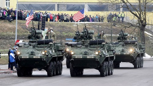 Xe bọc thép của Quân đội Mỹ tham gia lễ duyệt binh ở sát biên giới Nga ngày 24/2.