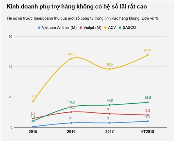 Riêng 6 tháng đầu năm nay, hệ số lãi của Vietnam Airlines (mẹ) chỉ là 4%, Vietjet (mẹ) là 8% thì bên phía SASCO lên tới 17%, còn ACV là 48%.