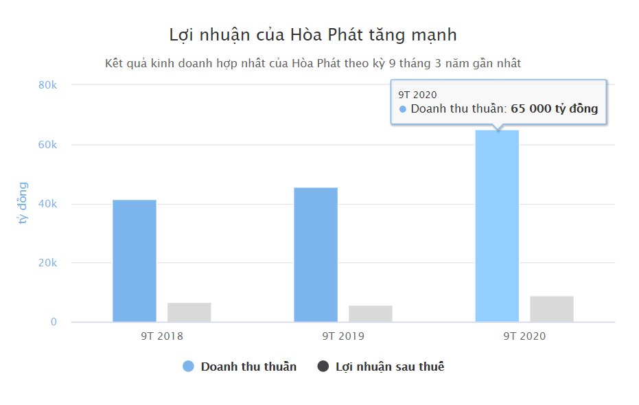 Lũy kế 9 tháng, Hòa Phát đạt doanh thu 65.000 tỷ đồng và lãi ròng 8.845 tỷ đồng. So với cùng kỳ năm trước, hai chỉ tiêu doanh thu, lợi nhuận lần lượt tăng 40% và 56% và cao hơn kết quả của cả năm 2019.