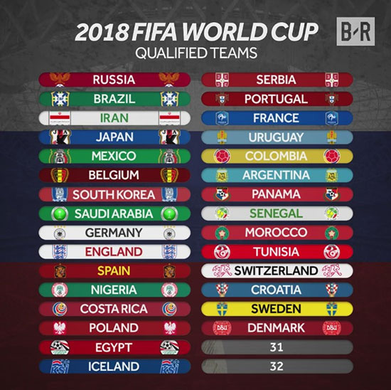 30 đội tuyển dự VCK World Cup 2018 mùa hè năm sau gồm: