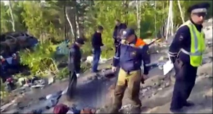 Một đoạn video ghi lại tại hiện trường cho thấy thi thể các hành khách nằm la liệt quanh chiếc xe buýt lật úp. Ảnh: Hiện trường vụ việc nhìn từ trên cao. Nguồn: NTV