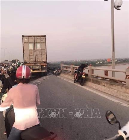 Xe container mất lái trên cầu Thanh Trì, hàng loạt xe máy bị tông xuống sông Hồng
