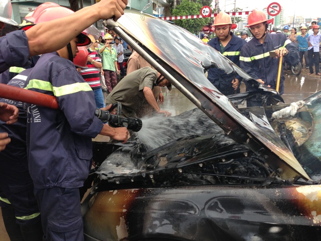 Khoảng hơn 10 phút sau, 4 xe cứu hỏa cùng hàng chục cán bộ, chiến sĩ Phòng Cảnh sát PCCC quận 2 đã có mặt tại hiện trường và phá nắp capo phun nước khống chế ngọn lửa. Tuy nhiên, toàn bộ phần máy và phía trước đầu xe đã bị cháy rụi hư hại hoàn toàn.