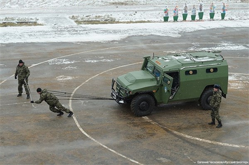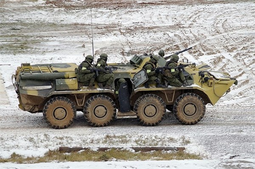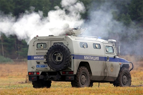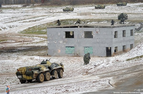 Cảnh sát đặc nhiệm vũ trang di chuyển cùng một chiếc xe bọc thép tại khu huấn luyện gần thủ đô Moscow.