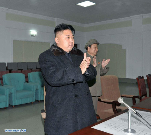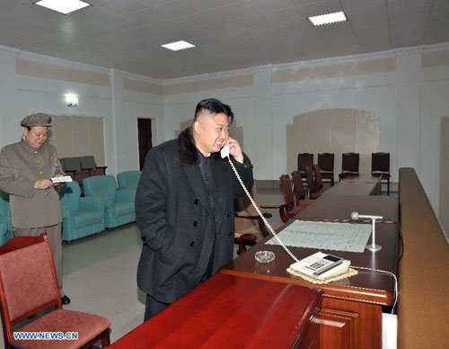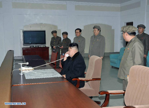 Kim Jong-un vui mừng nghe điện sau khi tên lửa Unha-3 đưa thành công vệ tinh lên quỹ đạo.