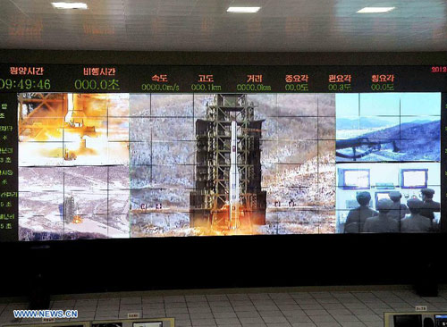 Một màn hình lớn trong trung tâm giám sát vệ tinh chiếu quá trình phóng tên lửa của Triều Tiên.