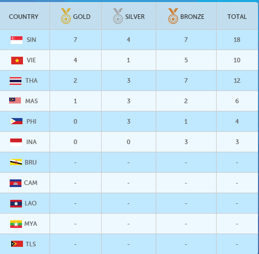 Bảng xếp hạng huy chương của 11 đoàn tính đến ngày 5.6.2015:
