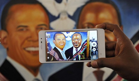 Một người chụp bức họa của Tổng thống Obama và người đồng cấp Kenya Uhura Kenyatta.