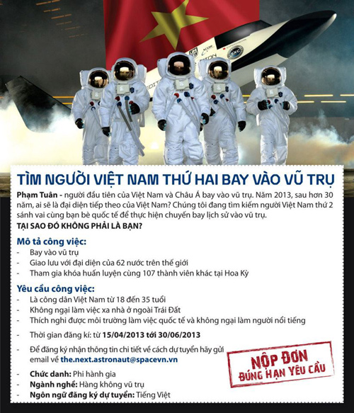 Một số trang tin việc làm, diễn đàn và mạng xã hội về thiên văn đều đăng tải thông tin này với tiêu đề hot "Tìm người Việt Nam thứ hai bay vào vũ trụ".