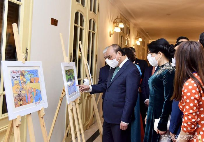 Chủ tịch nước Nguyễn Xuân Phúc và Phu nhân tham quan triển lãm các tác phẩm do trẻ em yếu thế sáng tác. (Ảnh: Nguyễn Hồng)