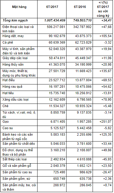 Số liệu thống kê sơ bộ của TCHQ về xuất khẩu sang Nga 6 tháng đầu năm 2017