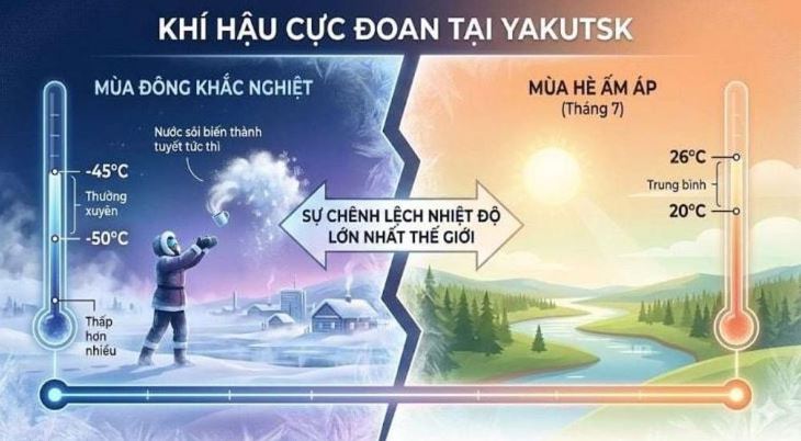 Đáng chú ý, dù mùa đông rét buốt, mùa hè tại Yakutsk lại khá ấm áp với nhiệt độ trung bình tháng 7 có thể đạt từ 20-26°C. Sự thay đổi này tạo nên biên độ nhiệt chênh lệch lớn nhất thế giới. Theo dữ liệu từ BBC, mức nhiệt cực đoan nhất từng ghi nhận tại đây là -64,4°C vào năm 1891. Bên cạnh cái lạnh, tình trạng thiếu hụt ánh sáng cũng rất nghiêm trọng; vào tháng 1, thời gian có ánh sáng mặt trời trung bình chưa đầy 4 giờ mỗi ngày.